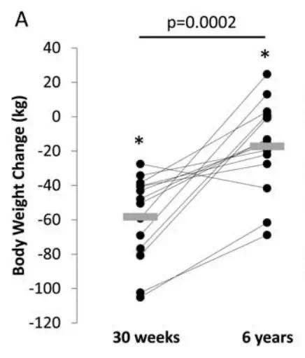 看下面这张图,这是他们30周赛期与其6年间体重变化,黑点代表个人,灰色矩形代表体重平均值。