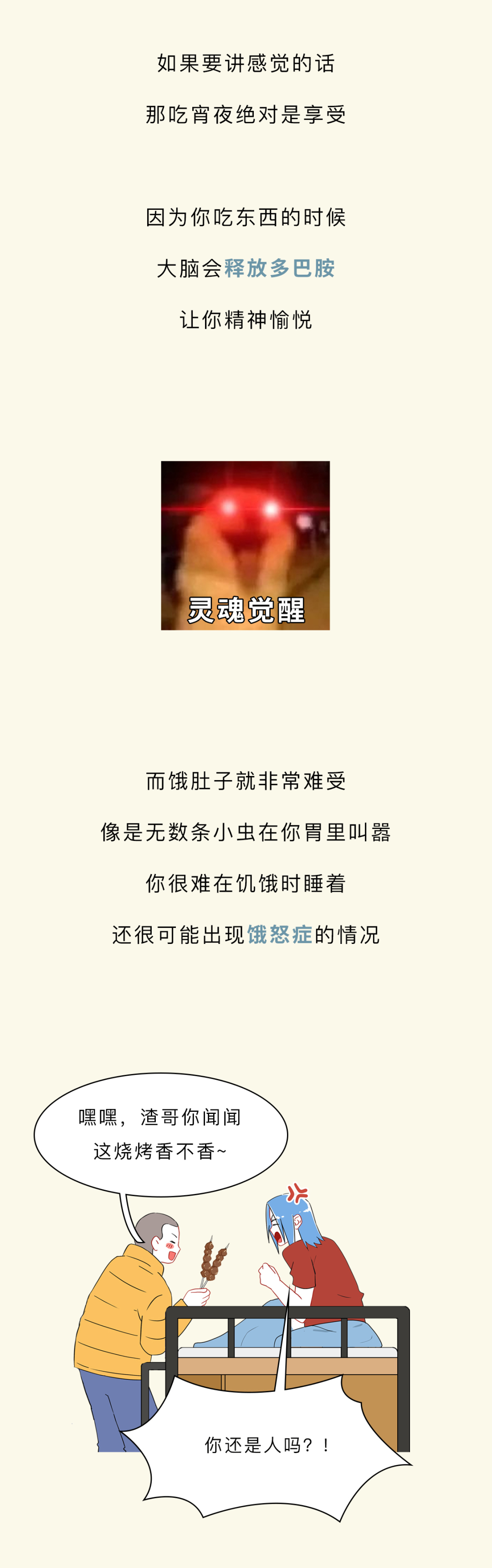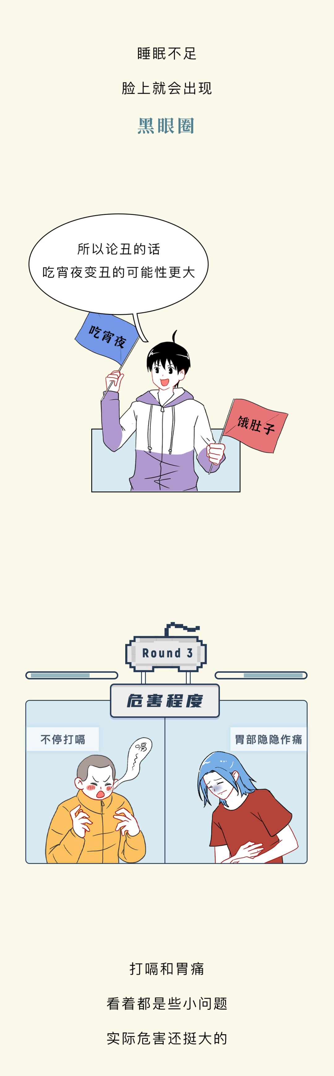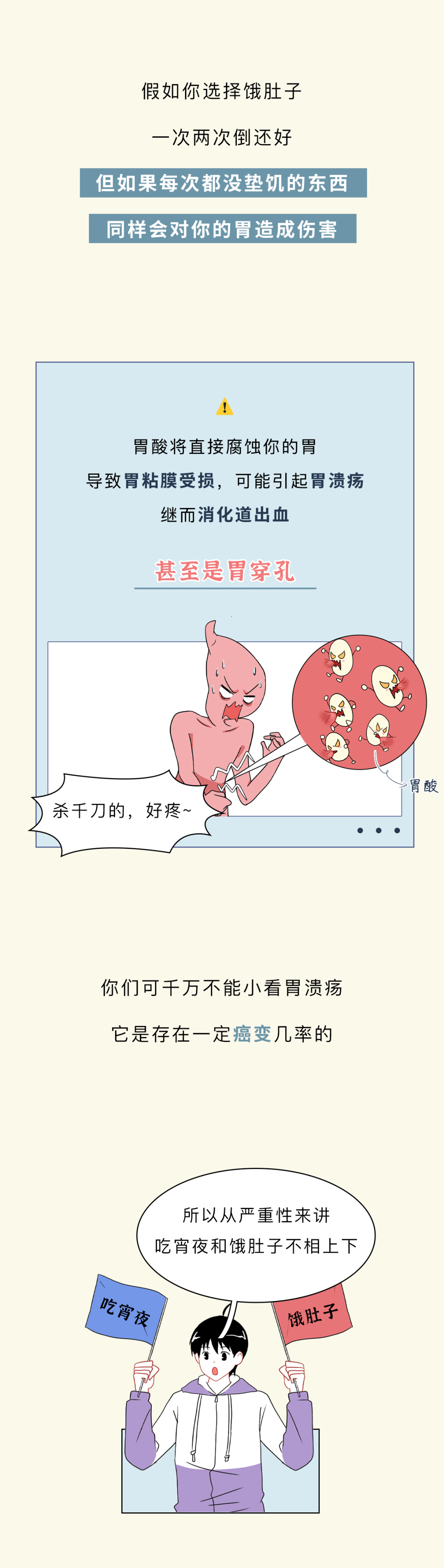 1.其实熬夜吃宵夜和饿肚子的行为都比不上熬夜本身来得危害大,熬夜对人体的伤害是不可逆的,也正是在熬夜的作用下,宵夜和饿肚子才有这么多隐患