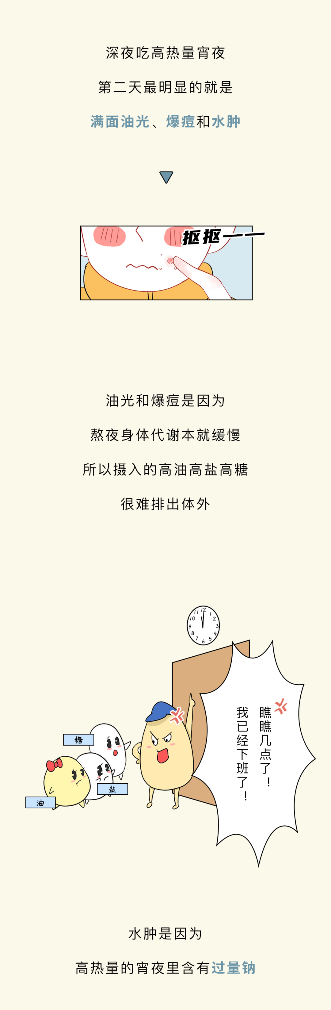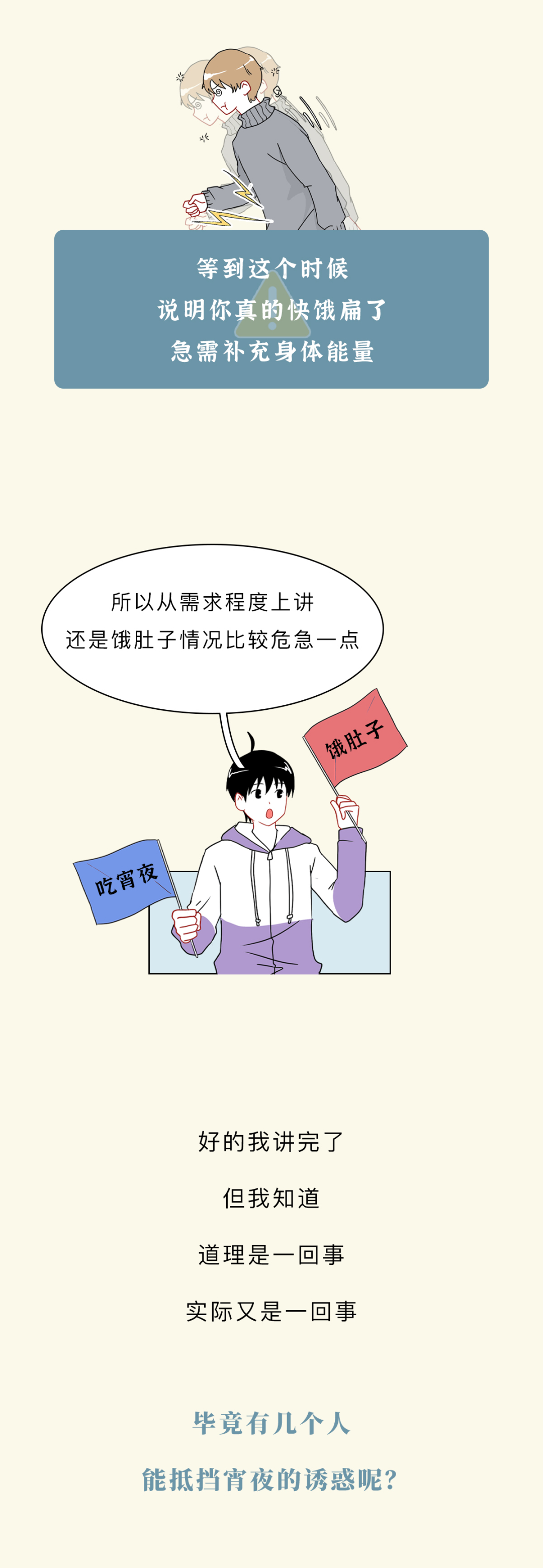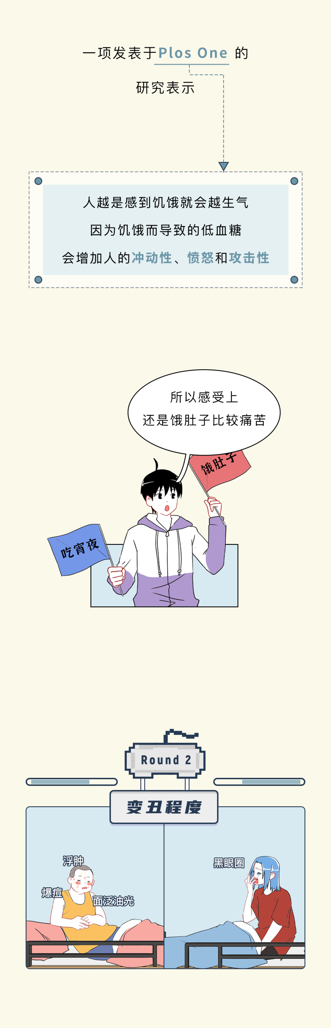 1.其实熬夜吃宵夜和饿肚子的行为都比不上熬夜本身来得危害大,熬夜对人体的伤害是不可逆的,也正是在熬夜的作用下,宵夜和饿肚子才有这么多隐患