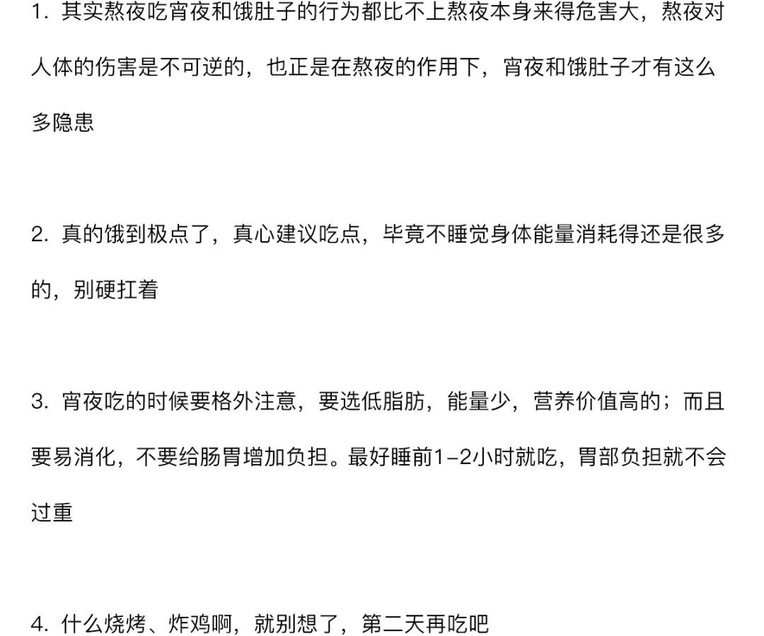 3.宵夜吃的时候要格外注意,要选低脂肪,能量少,营养价值高的;而且要易消化,不要给肠胃增加负担。好睡前1-2小时就吃,胃部负担就不会过重