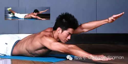 15,游式挺身:俯卧,伸展身体,双腿和双臂向四周充分伸展。拉长脊骨,伸展手臂,肩膀和双腿微离开地面。腹部和臀部收紧,保持颈部、脊柱成一条直线不动,慢慢抬高左手和右腿,还原至水平线,换右手和左腿抬高,始终保持双腿及双手不落地锻炼后背肌群\臀部。