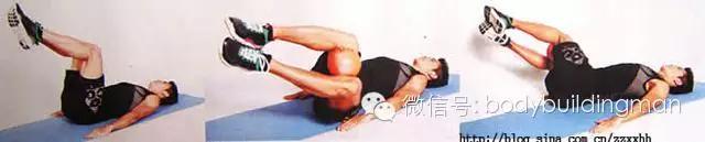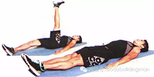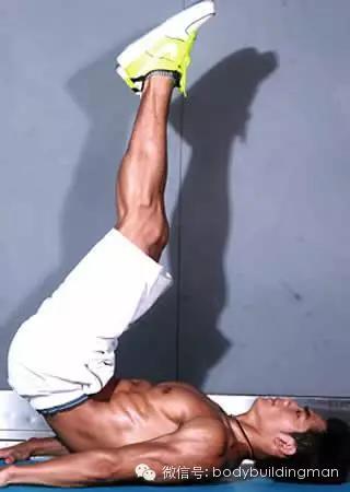 6,仰卧抬腿:仰卧,双臂伸直掌心向下放在体侧。双腿并拢抬起。保持膝关节角度不变,匀速抬起双腿,到高点后继续运动,使臀部抬离地面,此时应感觉到腹肌强烈的收缩。维持几秒钟,慢慢沿原弧线放下双腿,双腿在动作过程中始终不触地。