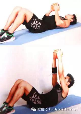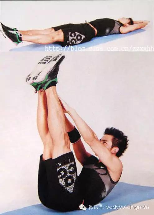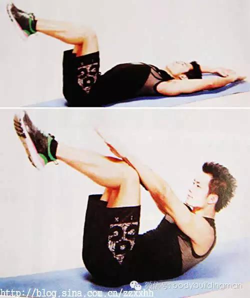 2,两头起:仰卧,头部略微抬高,双腿水平伸直,但不接触地面,双臂向头上方伸直,身体成水平的“一”字型。抬起双臂并向前伸出,肩部也随之离开地面,同时双腿向上抬起,双手触摸小腿。在高点稍停片刻,然后向下还原到起始姿势。呼气时坐起,吸气时还原。这个动作要求上下身要同时运动,这一点不太容易掌握,要加油练习。