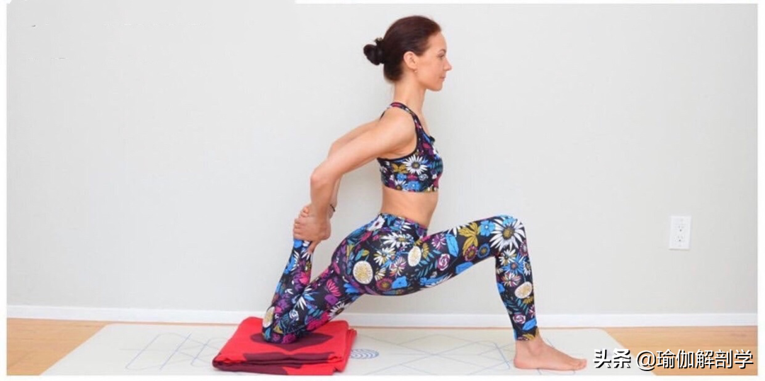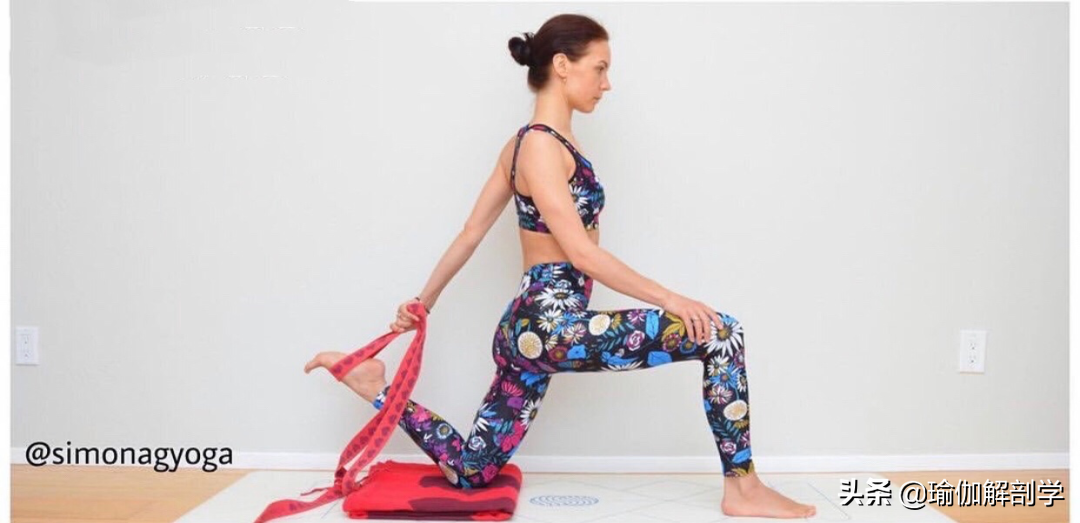 保持上一动作,膝盖落地左腿向后屈膝,脚跟找臀部右手向后抓左脚背,髋部下沉右膝外展,停留10-12个呼吸04、半神猴式