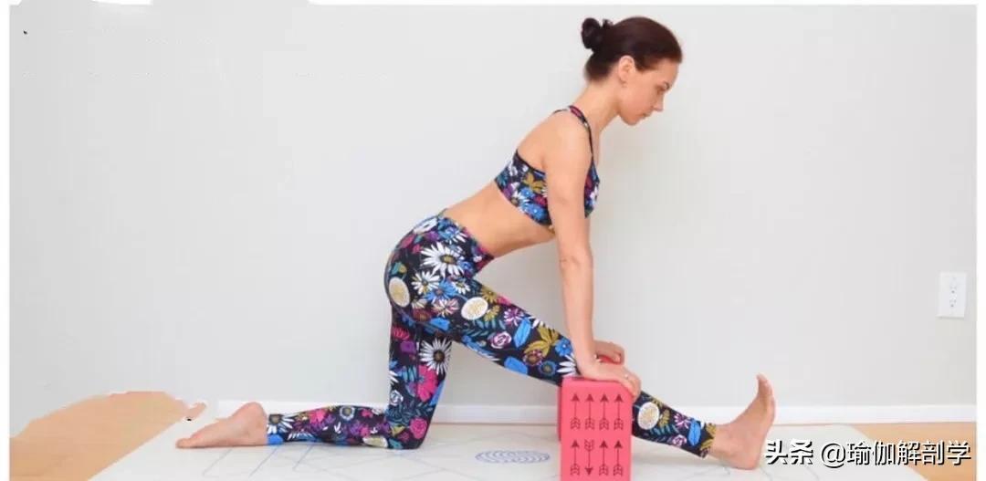 从上一动作退出,臀部向后右腿伸直、脚尖回勾,双手撑砖左大腿垂直地面,进入半神猴式注意髋部摆正,脊柱延展双肩下沉,停留10-12个呼吸05、加强侧伸展式