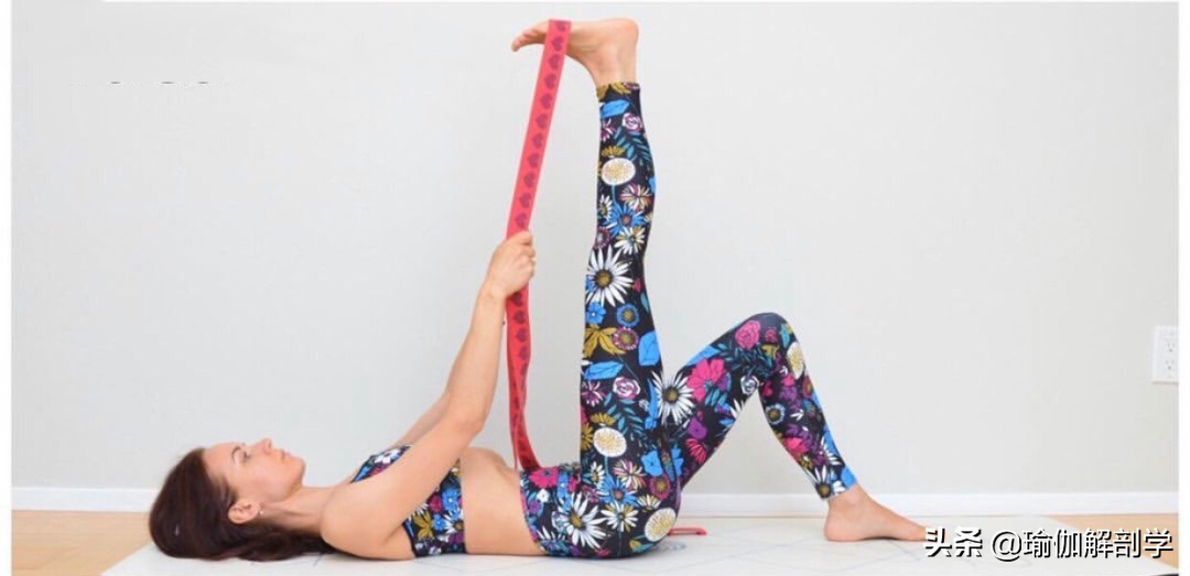 仰卧,左腿屈膝,脚掌踩地吸气,右腿伸直,脚掌套伸展带双手拉住伸展带向身体的方向停留10-12个呼吸后换另外一侧