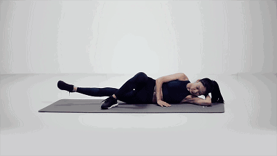 侧卧在地面上,下方的手臂弯曲,将头部垫在上面,上侧的手臂弯曲,用手掌贴住胸前的地面。外侧腿跨过内侧腿用脚尖触地,内侧腿伸直,用力向上方抬起,抬至高点缓慢下移,下移时始终不要接触地面,多做几次,之后可以换腿进行。