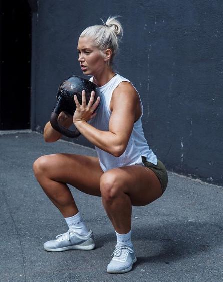 双脚之间的距离分开大概是肩宽的两倍,双手放在身体的前面,在胸前位置,手掌相对。背部保持直挺,腹部收紧,用臀部向后坐,直至膝盖弯曲,大腿平行地面。稍作停顿,起身还原,动作进行中腰背始终保持稳定状态,重复进行。