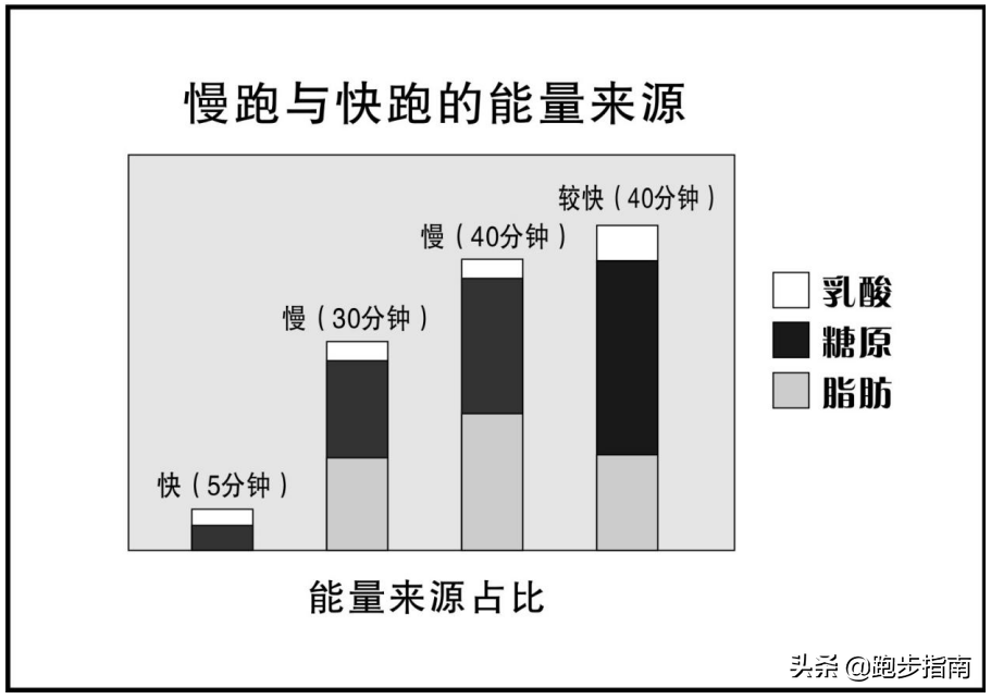 可以看到,随着运动强度的增加,脂肪的供能比例降低,而糖原的供能比例增加。也就是说,低强度有氧运动的时间越长,脂肪供能的比例就越高。