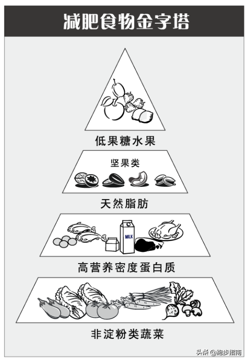下图是《减肥食物金字塔》,可以按照这个比例来选择食物,记住尽量选择天然清淡的食物,才算吃得健康。