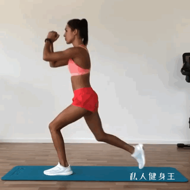 动作要领:双脚前后分开站立,双手交握放于胸前,吸气身体垂直下蹲至前后膝盖约90度,呼气前面的腿发力使身体站直,后面的膝盖向上提膝,左右各做15个,重复4组。