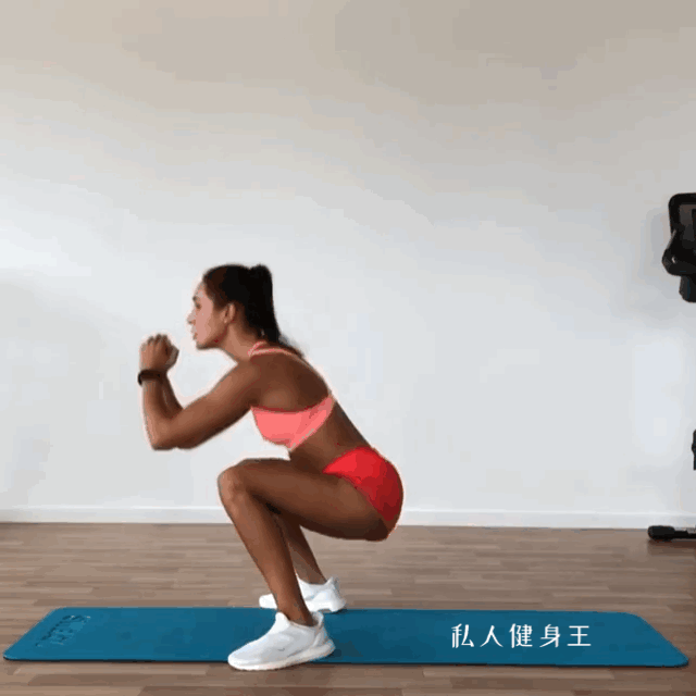 动作要领:身体站立,双腿分开比肩略宽,双手交握放于胸前,吸气臀部向后向下蹲,腰背挺直,呼气核心收紧向上跳跃,一组15-20次,重复4组。