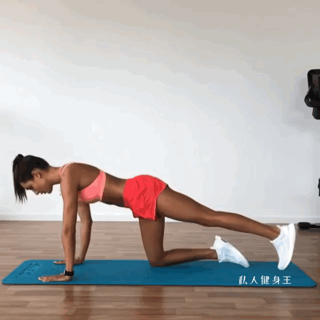 动作要领:双手双膝分开与肩同宽,支撑在垫子上,核心收紧腰背挺直,不要低头或者抬头,成四足支撑,呼气抬起一条腿向后伸直,保持髋关节处于伸展状态,然后呼气臀部发力使伸直的腿部向后抬高,一组15次,左右各做4组。