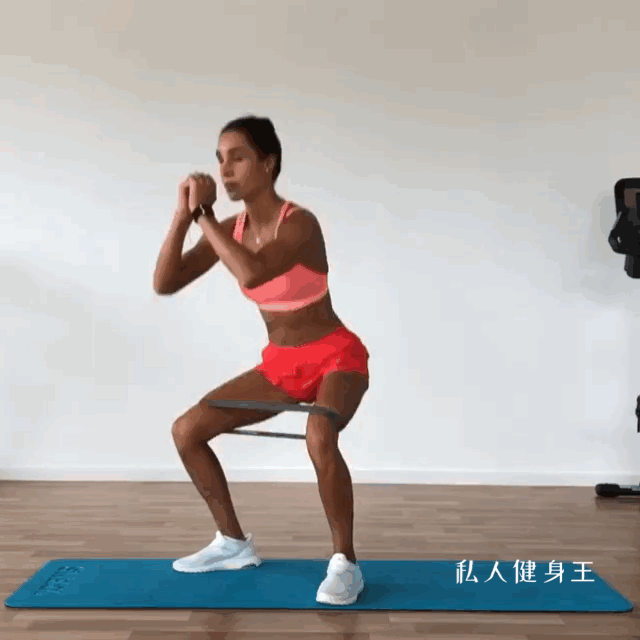 动作要领:将弹力圈套在双腿膝盖上方,双腿分开比肩略宽,核心收紧臀部向后想下蹲,下蹲时上半身保持腰背挺直,膝盖与脚尖朝同一个方向下蹲至大腿平行地面。一组12-20个,重复4组。