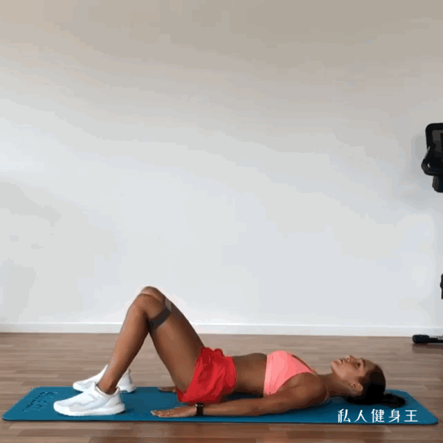 动作要领:仰卧在垫子上,双手放在身体两侧弯曲双膝双脚分开与肩宽支撑地面,呼气核心收紧,臀部发力向上抬高至顶点,感受臀部收缩,吸气放下至接近垫子然后再一次向上抬高,一组15-20个,重复4组。