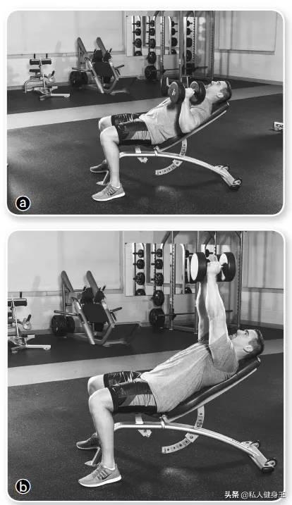 b. 举起哑铃至双臂伸直(不要锁紧肘部),此时,哑铃在上胸部正上方,彼此接触,掌心相对。. 在整个动作过程中必须保持肘部弯曲。