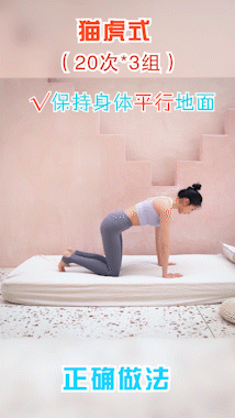 1、跪撑于垫面,双手分开与肩等宽,双腿分开与髋等宽,保持收腹,脊柱伸展。2、呼气,卷腹,背部上推。3、吸气放松回到原位。4、完成20次*3组注意: