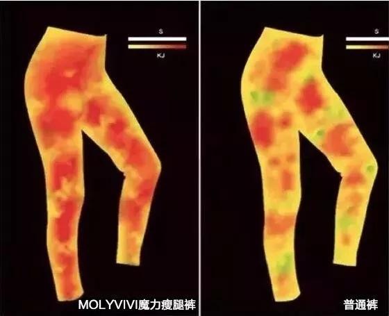 所以穿着它进行简单的健身运动,比如瑜伽或慢跑,燃脂率都能事半功倍,将它和普通运动裤对比,可以发现在热力图中,这条魔力裤燃脂率更高。