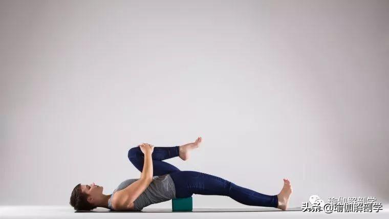 仰卧,将瑜伽砖放在骶骨处,双腿伸直,脚尖回勾,抬起右腿靠近腹部,左腿用力延展下压,保持3-5个呼吸,换另一侧,重复练习1-2组。