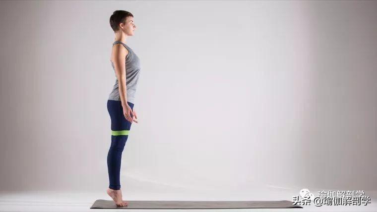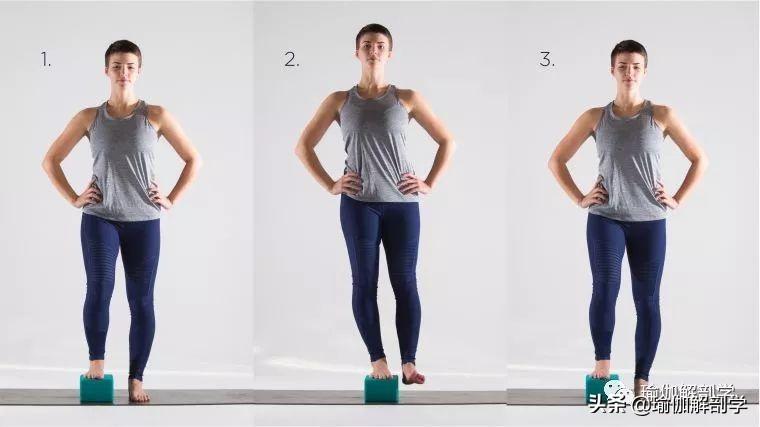 山式站立,一只脚站立在瑜伽砖上,另一条腿做上下的动态练习1-2组。