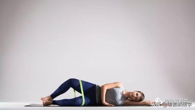 侧卧,微屈双膝,双腿套伸展带,呼气,双腿打开与弹力带对抗,动态练习1-2组。