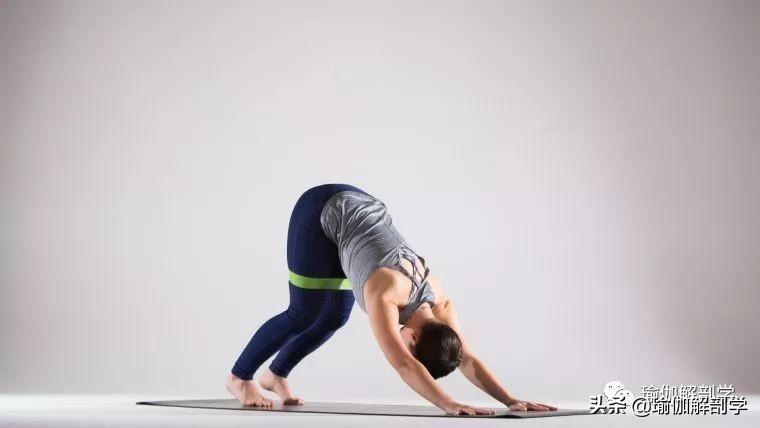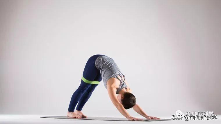 双大腿套伸展带,做下犬式,注意将注意力集中在双腿上,尽力的去拉伸大腿后侧。