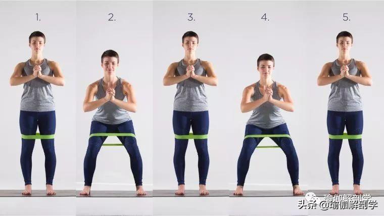 用伸展带套住双腿,双脚打开与肩同宽或者略大于髋部,做动态的蹲坐练习1-2组。