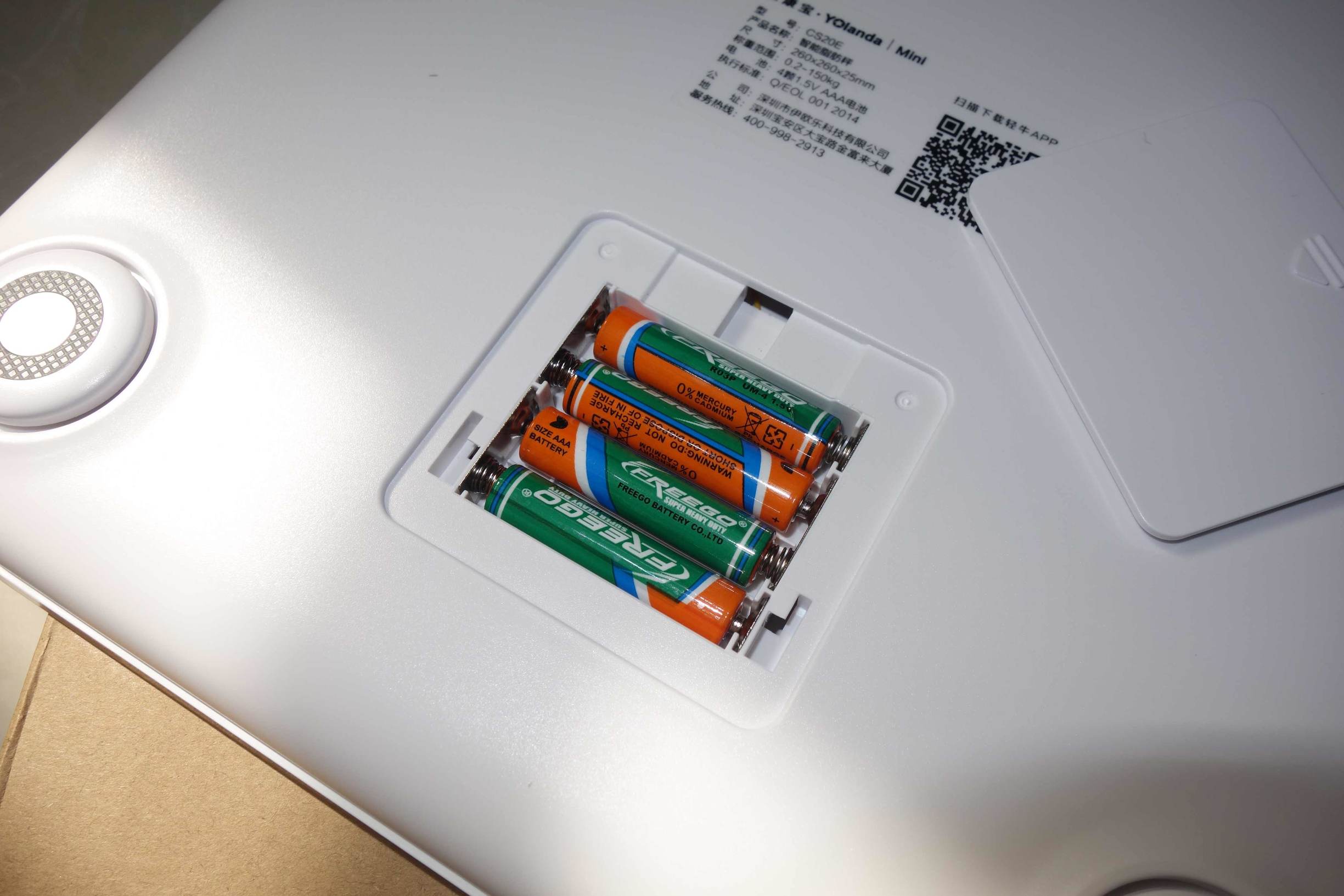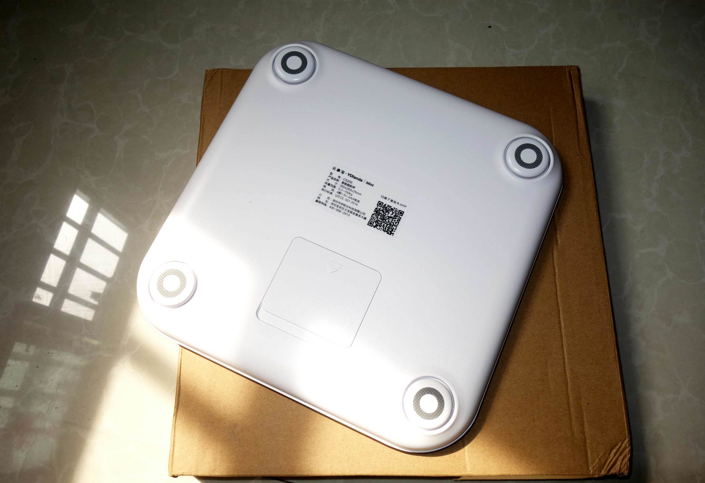 ↑秤体背面比较简单,一张产品铭牌、电池仓与四个圆形秤脚。