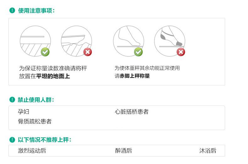 这台体脂称也是有禁用人群的:孕妇、心脏搭桥患者、骨质疏松患者是明文提示禁止使用的。