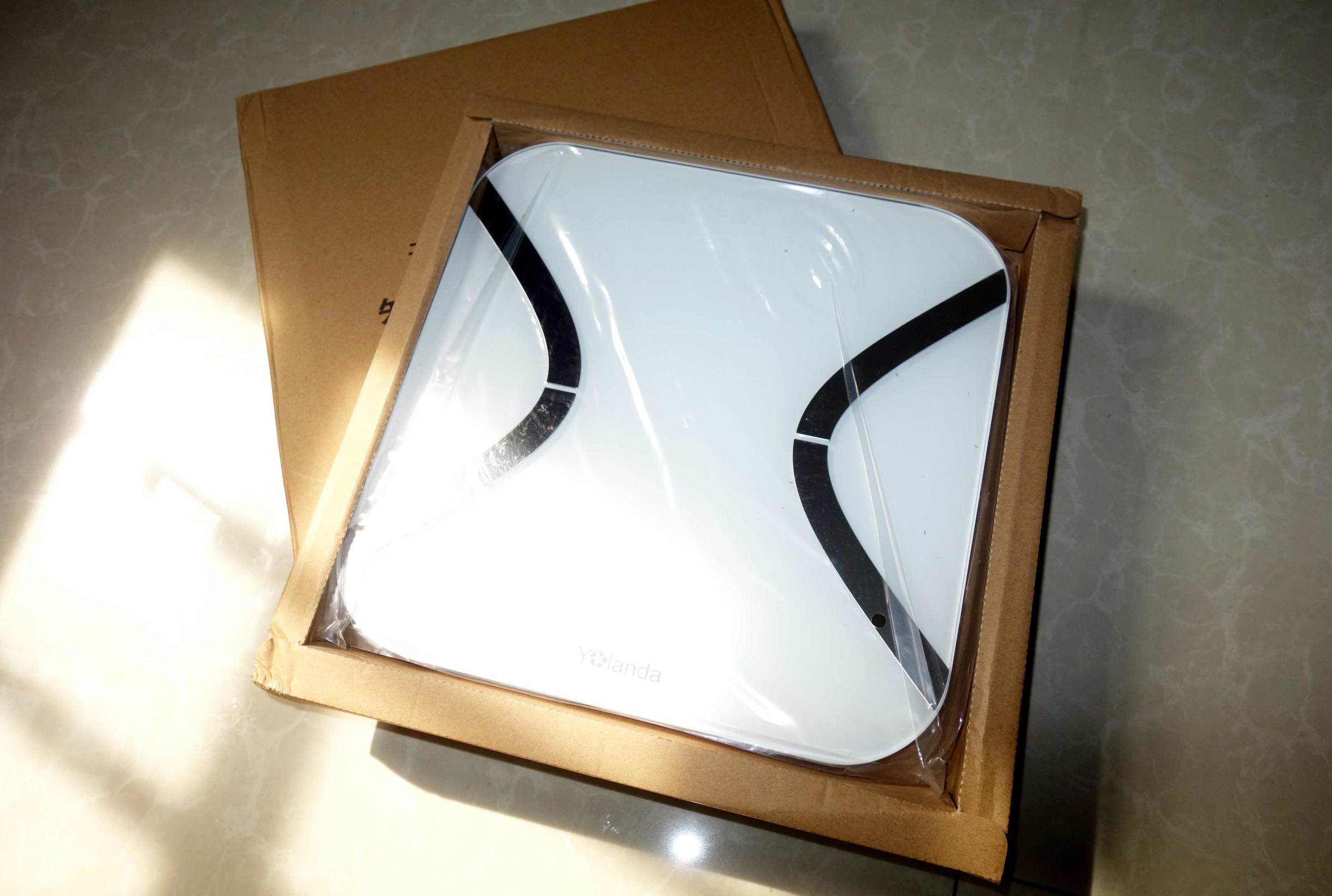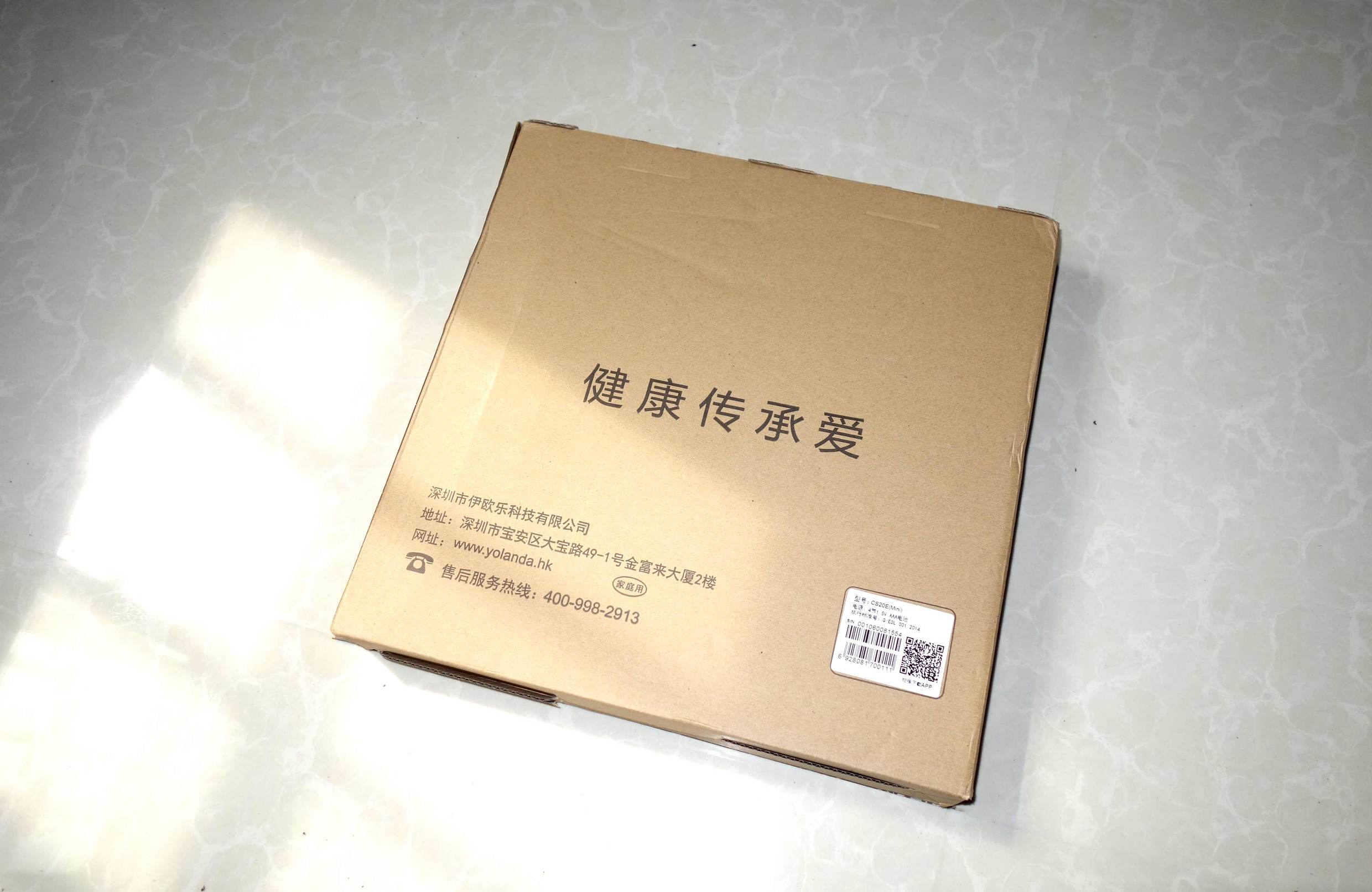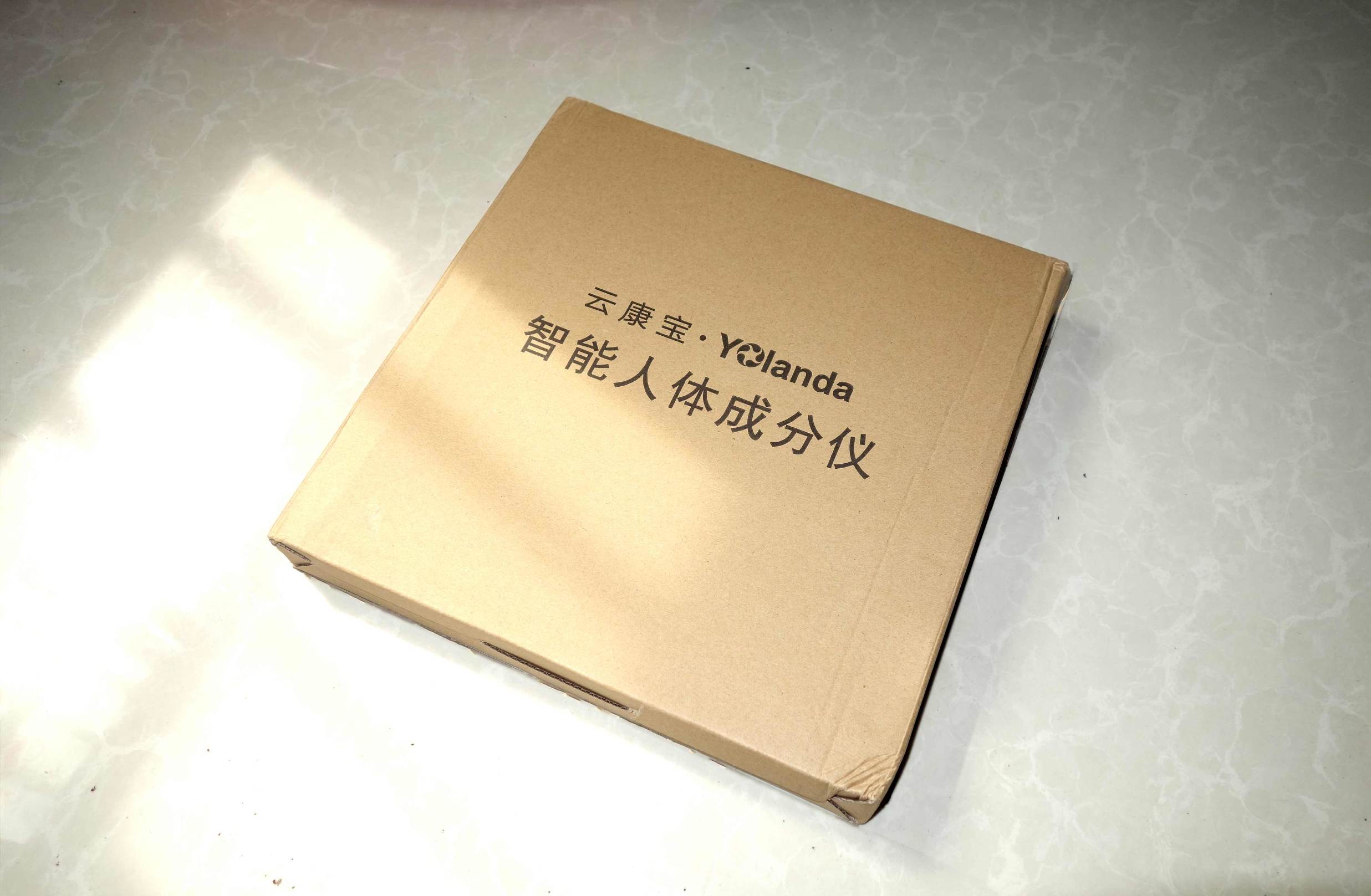 ↑这台云康宝Yolanda体脂秤Mini在外包装方面做的还算是中规中矩吧,简单的牛皮纸箱包装,正反两面都简要的印刷了产品的一些信息,这个“智能人体成分仪”写的不错,从这句话就可以想到这不止是一台普通的只能测体重的秤。外包装背面贴了一个小标签,使用手机即可下载与这台体脂秤搭配使用的app——轻牛。