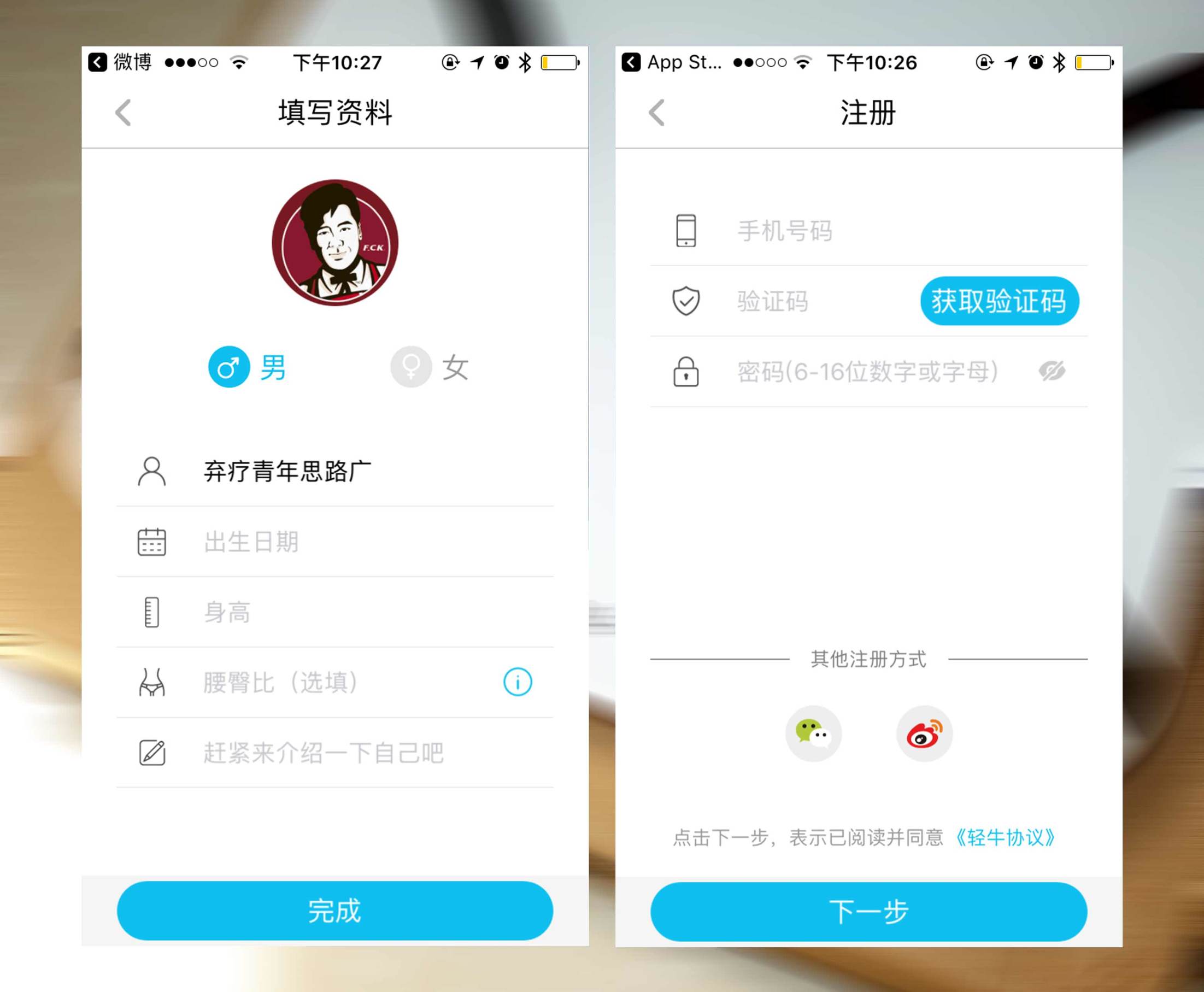 ↑轻牛app,一款与Yolanda体脂秤Mini相搭配使用的手机应用,在手机各种app商店都可以下载到,安卓与ios都可以兼容,这款app提供了手机号、微信、微博等不同的登录方式;登录完成后会提示使用者输入一些基本的资料,如年龄、身高等,这在后续也是可以更改的。