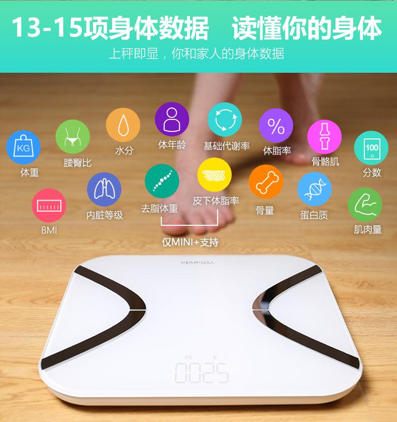 ↑Yolanda体脂秤Mini支持多达15项身体数据的检测,我们平时所关心的体重、体脂率、水分、BMI等各项数据全都可测,另外与一般的单频测量不同的是它采用了双频BIA算法测脂肪,与单频相比双频测量将会是数据更为,我想这在体脂秤行列还是蛮有竞争力的。