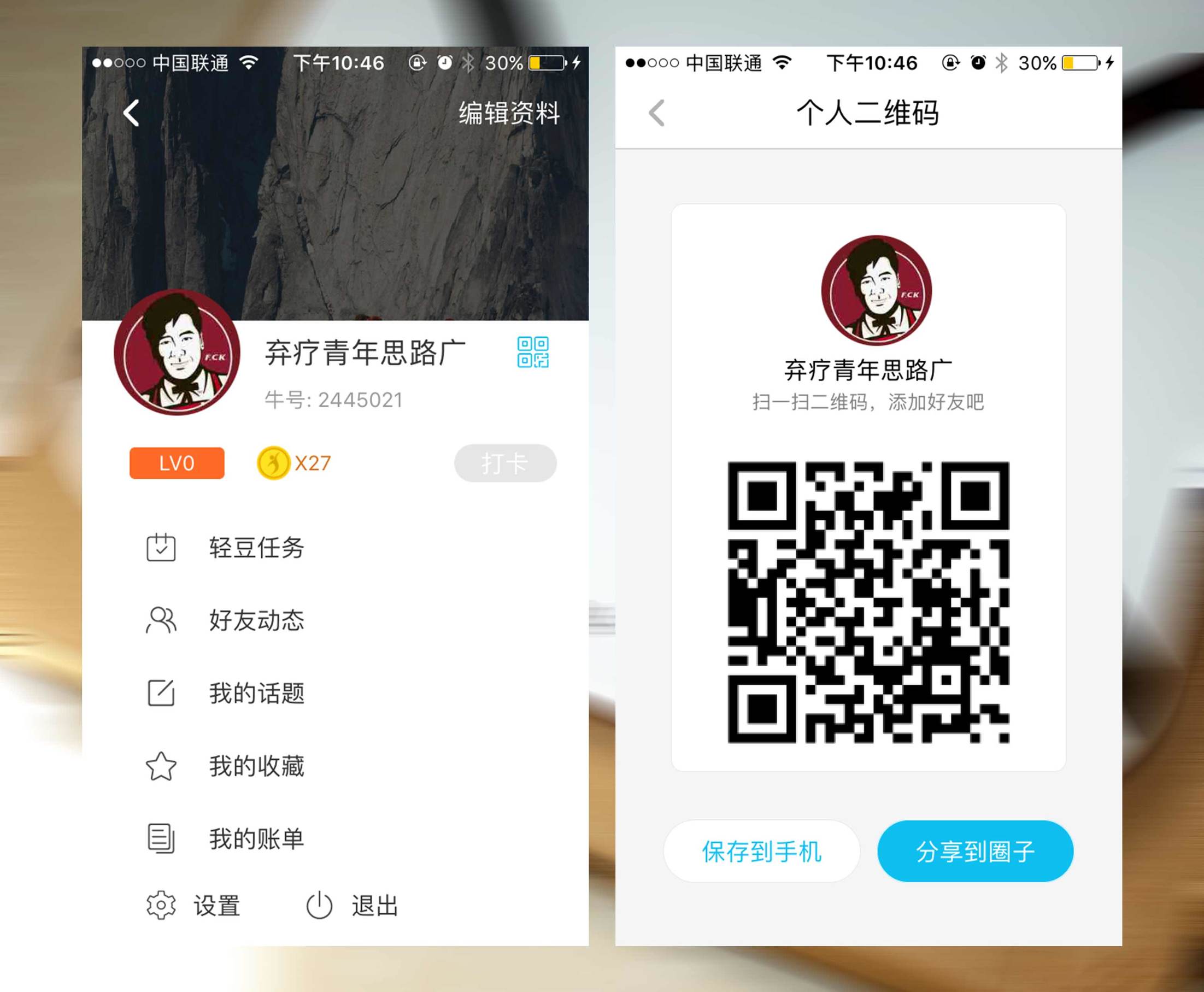 ↑个人中心,在这个页面可以查看好友的动态、查看我的话题与收藏、分享自己的二维码添加好友,还可以每天进行打卡领轻豆、做任务赢轻豆,我想或许后续版本app会加入一个兑换商城之类的吧,现在我是暂时没有发现商城的入口,以后如果轻豆可以兑换周边或者智能硬件也是一个不错的选择。
