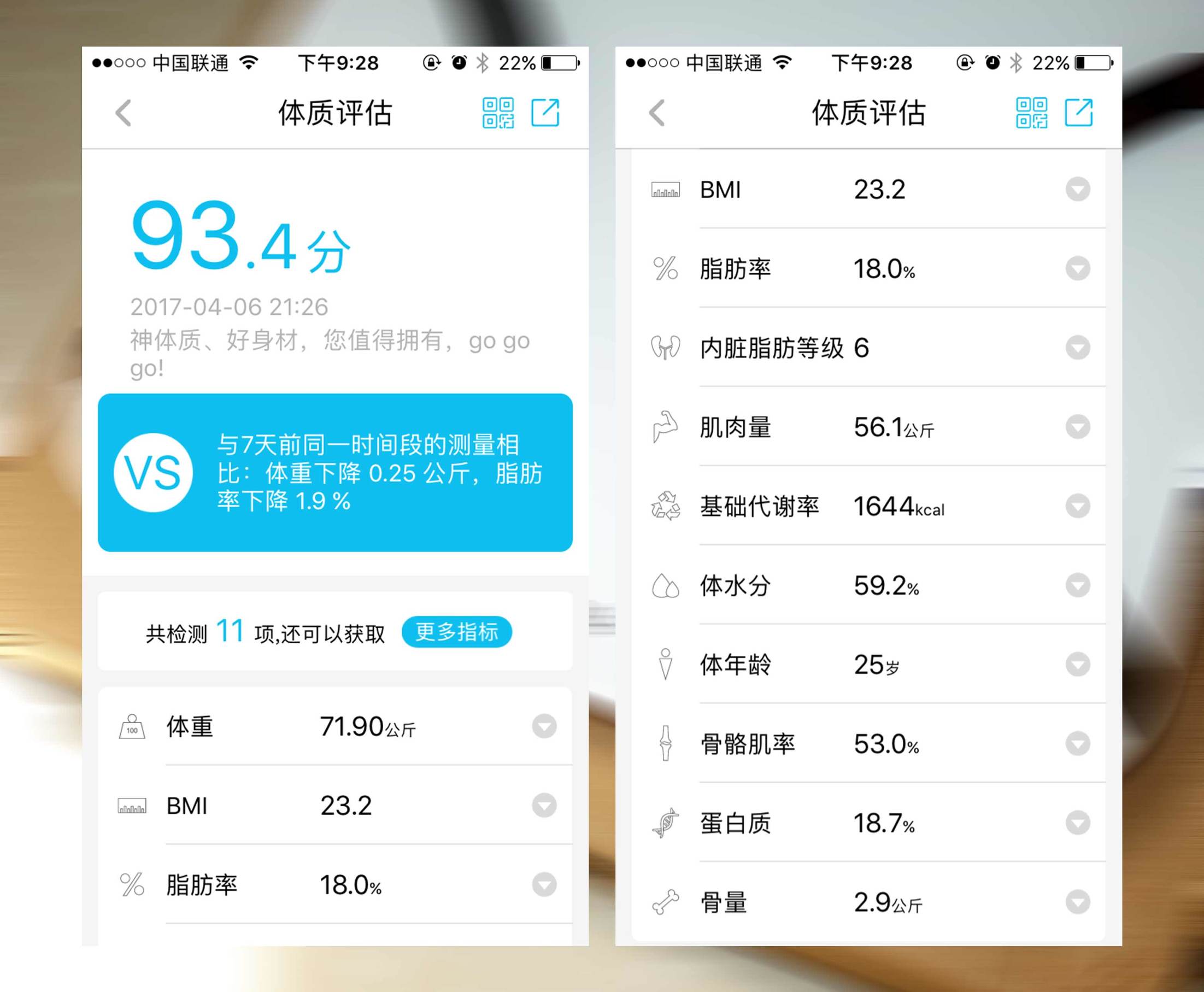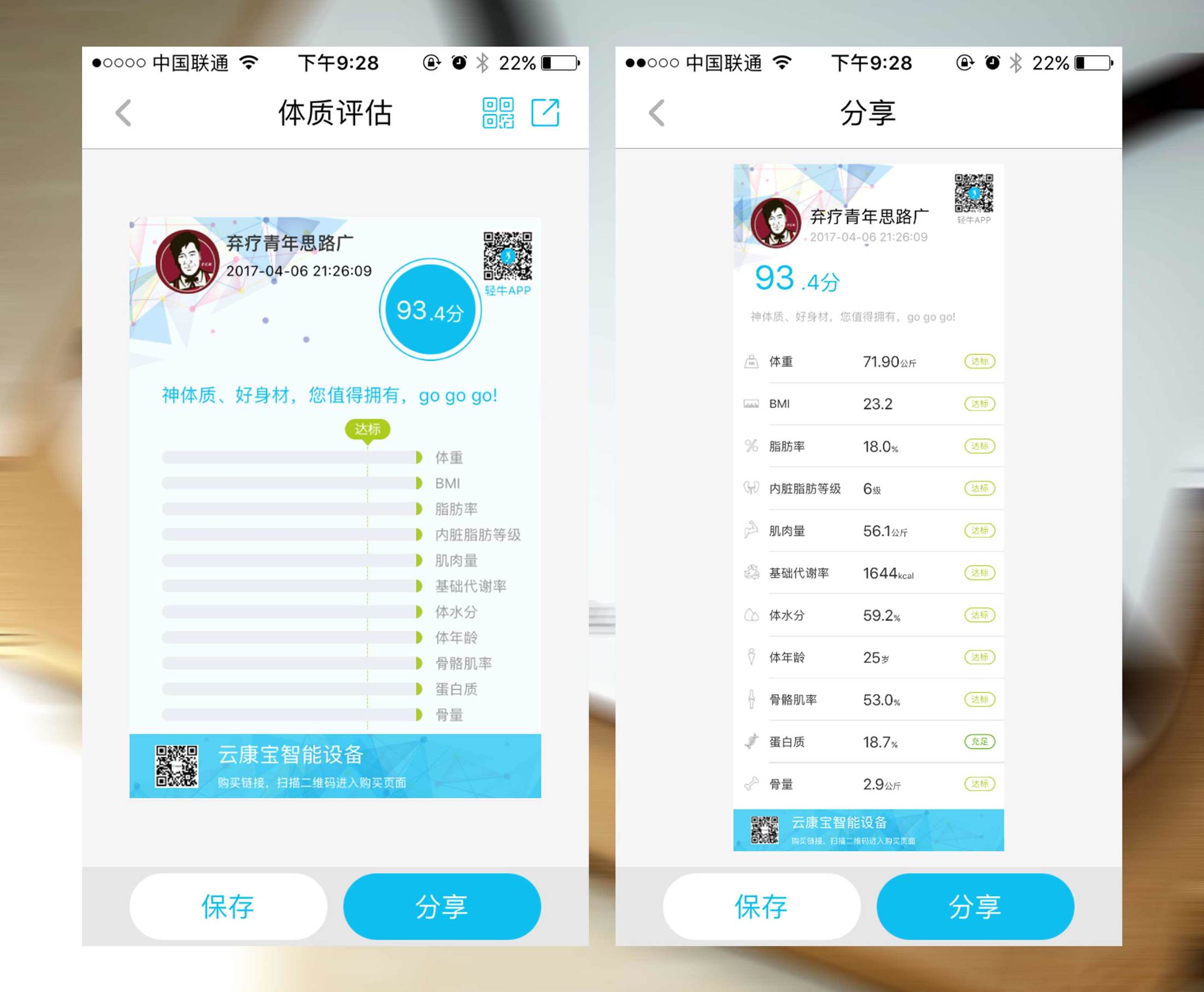 ↑测量完身体数据后还可以分享到朋友圈、微信等炫耀一番成绩,随时与好友共同感受减脂的成果。