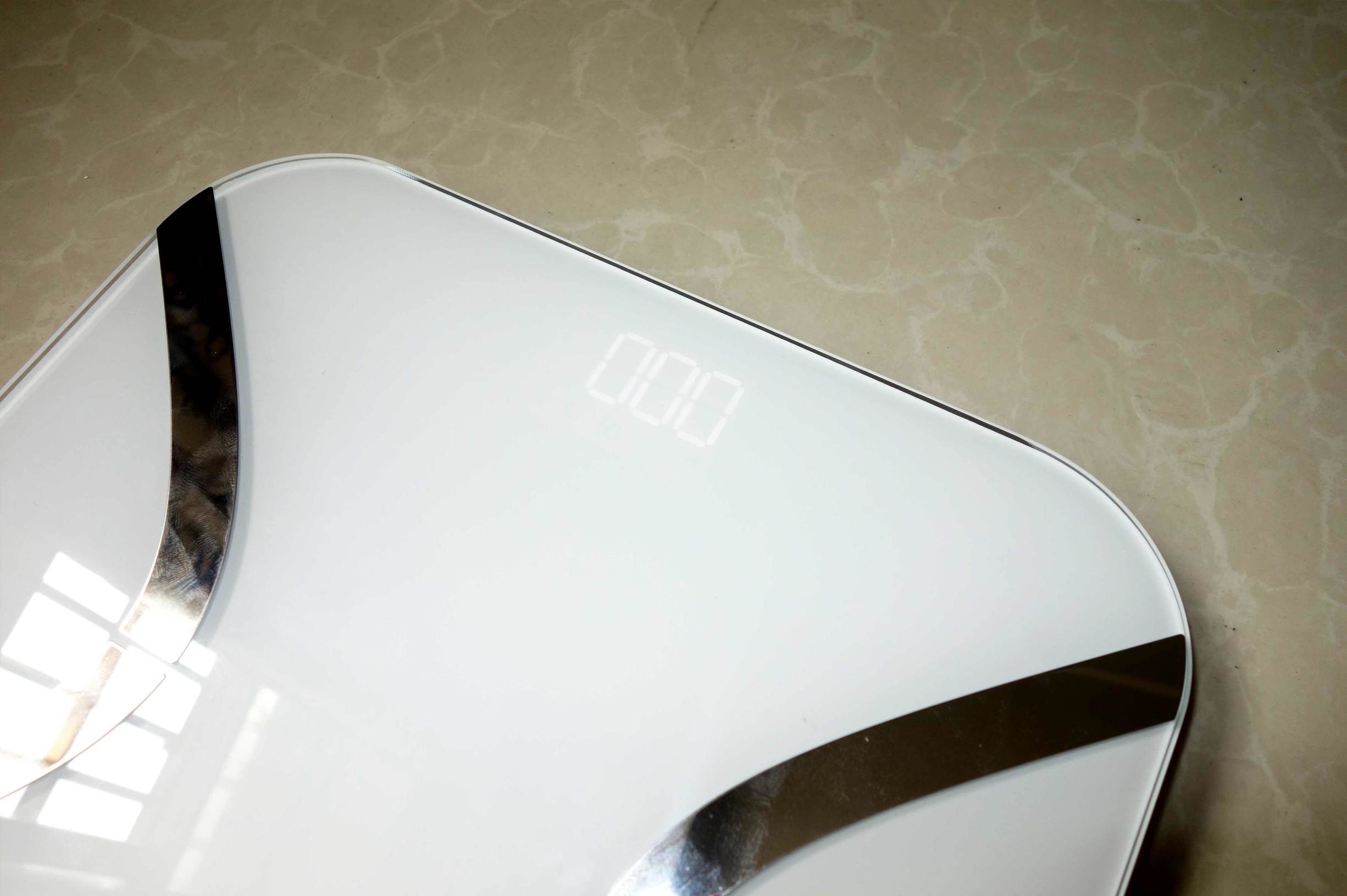 ↑这款体脂秤采用的超白钢化玻璃晶莹透亮、质感十足,钢化玻璃是方便清洁的一种材质,秤面采用钢化玻璃自然能够成为主流。