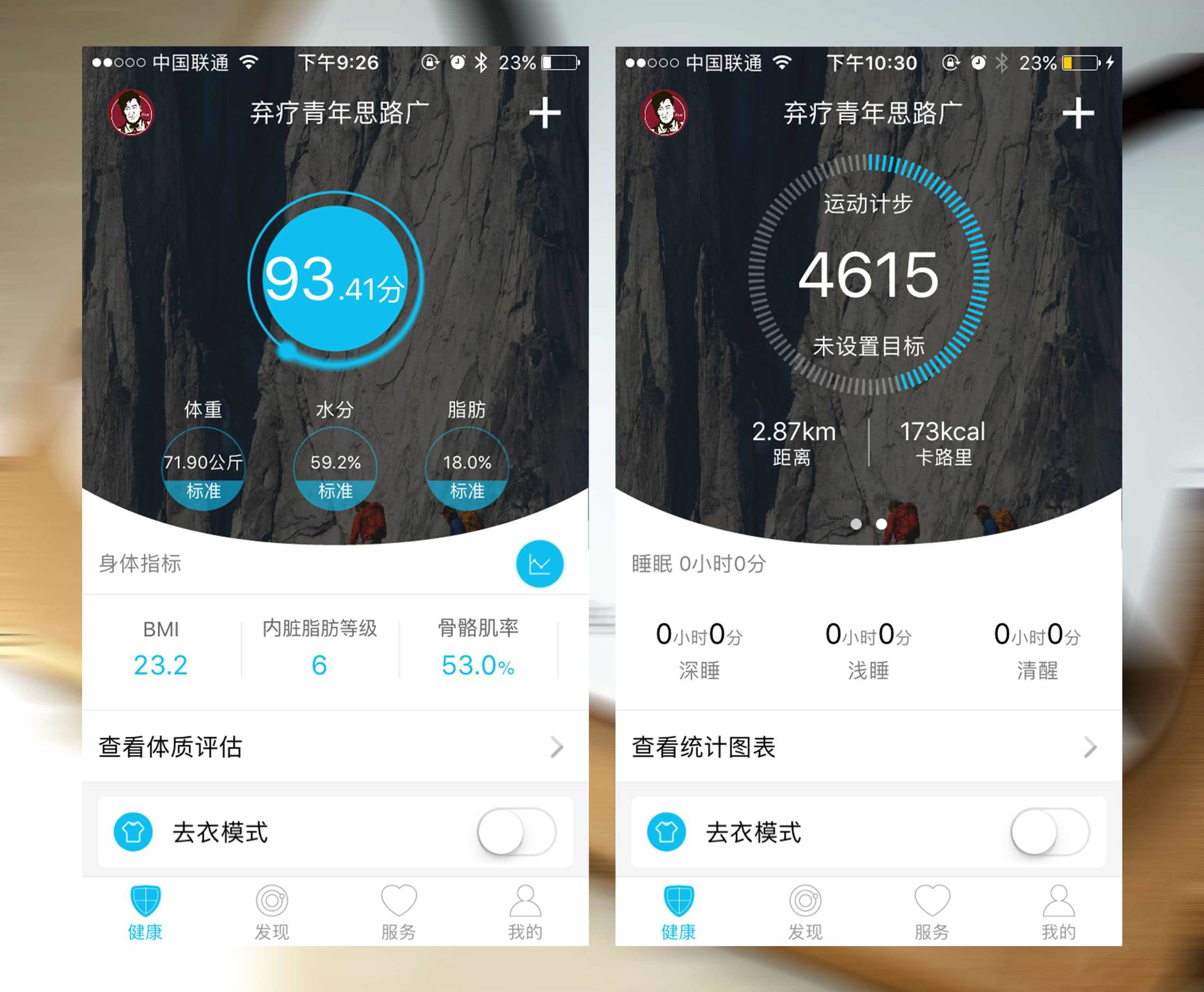 ↑进入app首先看到的其实是身体指标页面,左右滑动的话可以切换指标与运动计步的不同贴片;底部分成了四个母菜单,可以切换查看不同的内容与信息。值得说一下的是app页面会随着体脂称实时显示测量者的体重数据,然后会根据测量结果综合各项数据做一个打分。
