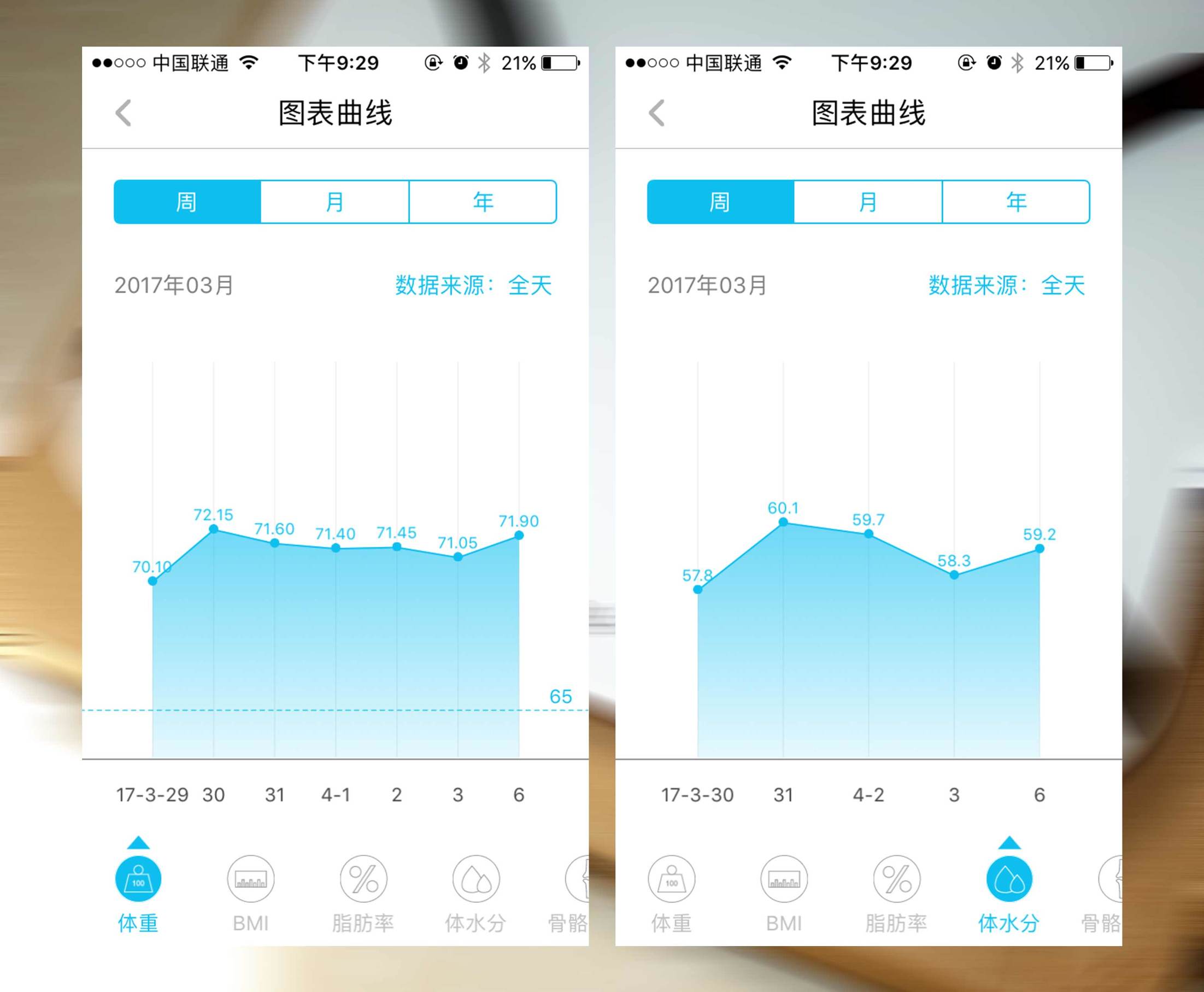 ↑图表曲线,在这里可以通过曲线来直观的了解到身体每项数据每次测量的变化趋势。
