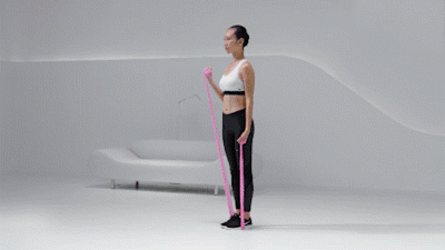 2、双脚踩紧弹力带,腰背挺直,向上呼气,向下吸气
