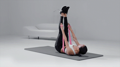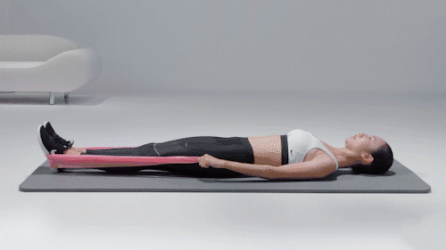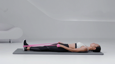 2、保持腹部收紧,腰部贴紧地面,弹力带压在腰部使其绷紧