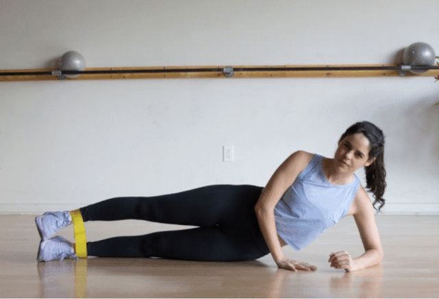 1、将弹力带绑在膝盖上方,屈膝侧卧,手肘支撑地面