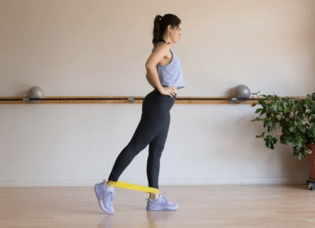 1、将弹力带绑在脚踝上方,双脚分开与臀部同宽