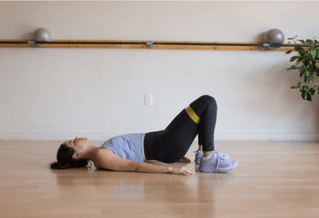 1、将弹力带绑在膝盖上方,头和肩紧贴地面,双脚平放分开与肩膀同宽