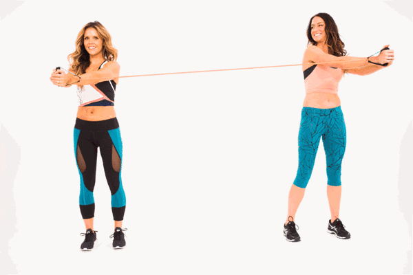 1、大臂贴紧身体,双脚并拢,双脚踩紧弹力带