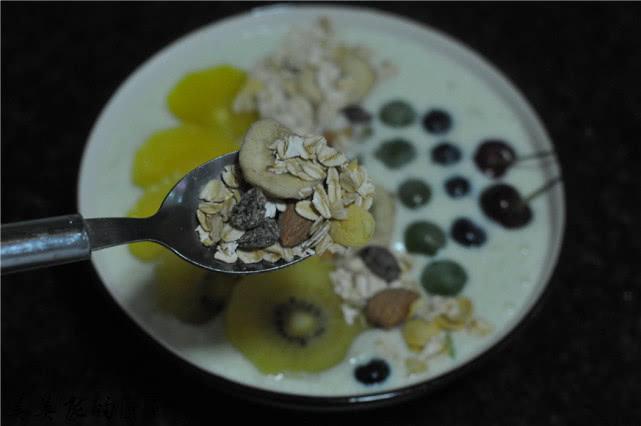 所有的食材都准备好,水果的种类尽量选择颜色鲜艳点的,再搭配点麦片营养和口感都更丰富。