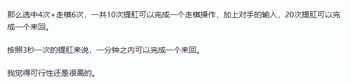 人们煞有介事地讨论着“肛珠型”智能计算机的可行性:有人通过计算,得出了每步棋尼曼需要让括约肌收缩舒张14次的结论;另一位选手通过优化逻辑,将数量降低到了10次。