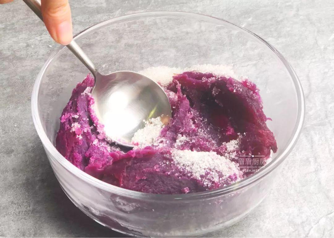 2、蒸熟的紫薯加入20克白糖,压成紫薯泥;