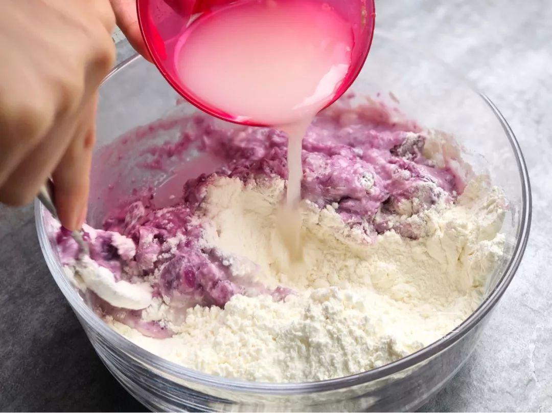 4、紫薯泥中倒入280克面粉,倒入酵母水,边倒边搅拌成絮状;