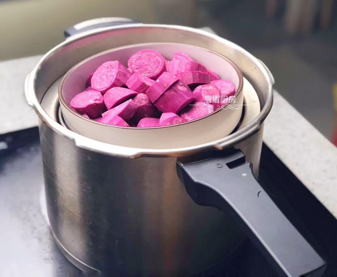 1、紫薯洗净切块,放入鹅妈妈压力锅上压8分钟蒸熟;