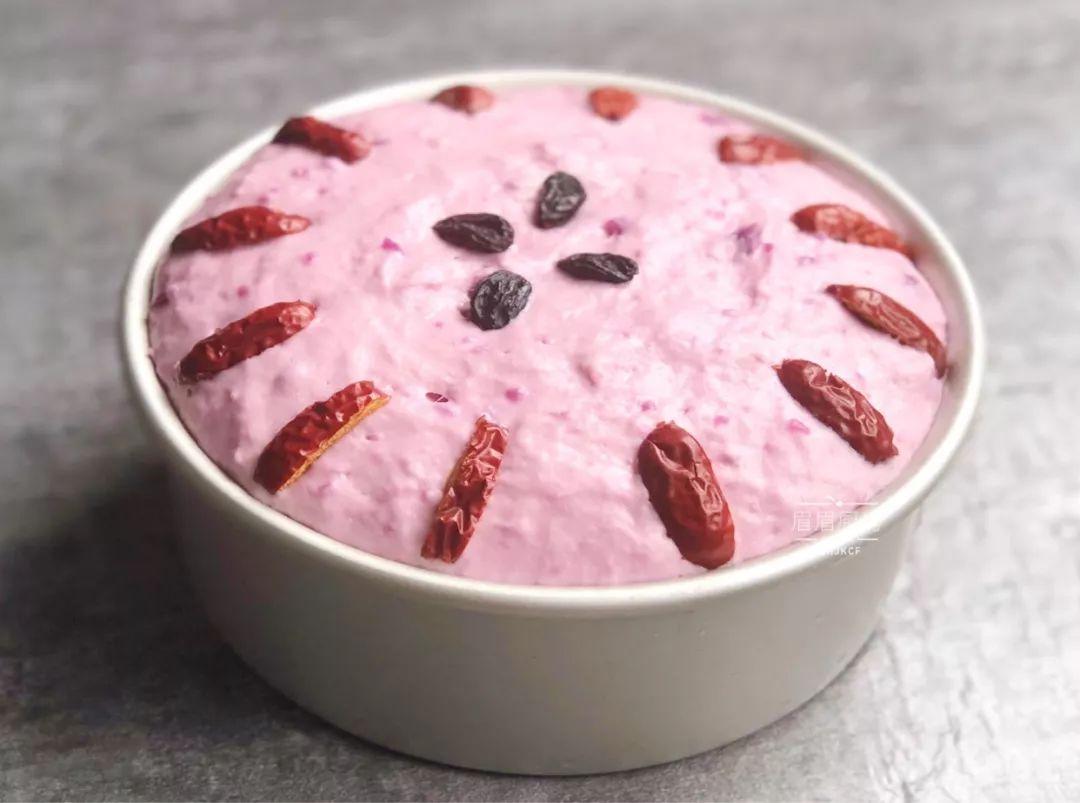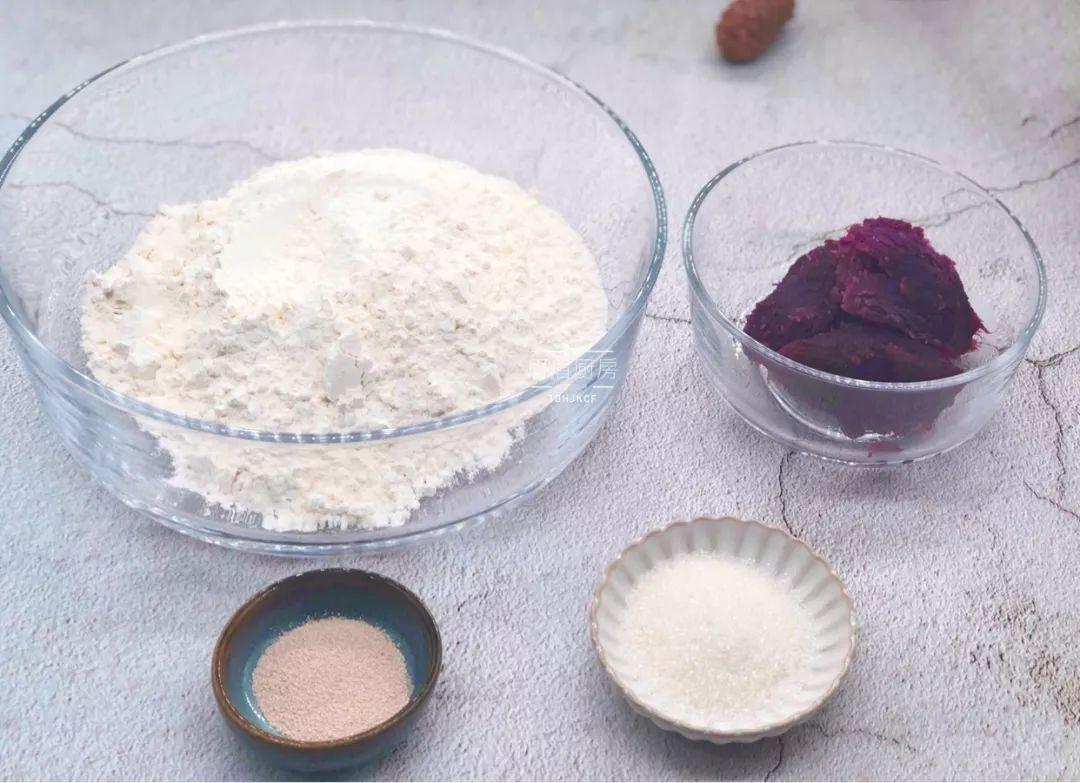材料和工具紫薯泥 200克、 面粉280克、细砂糖20克、干酵母3克、温水220克、红枣、黑加仑干少许