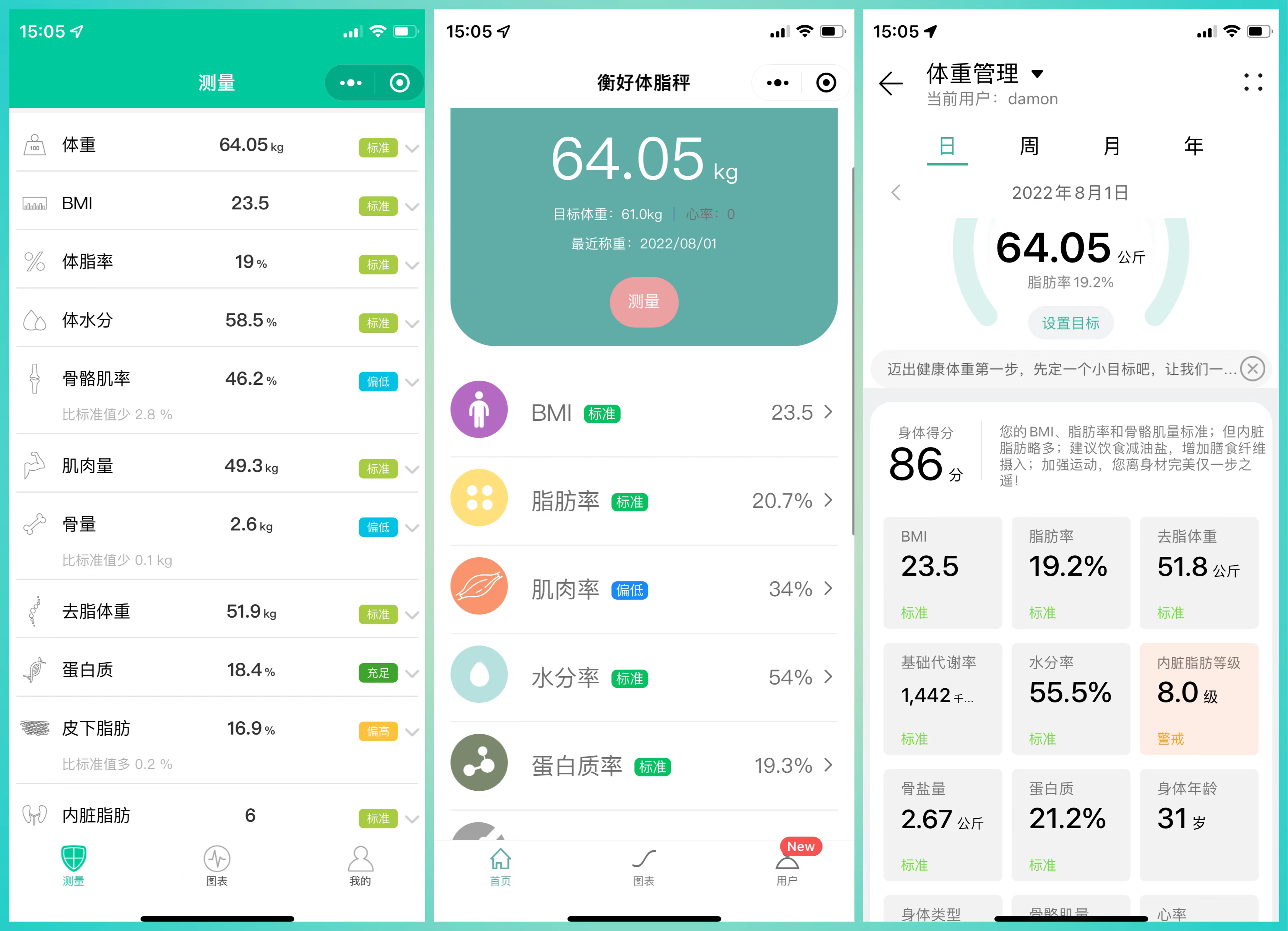 我选取了三款体脂秤来作为参考:云康宝、衡好和华为。